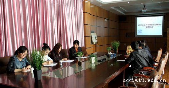 首先,双方一同观看了武汉纺织大学宣传片。看到我校近年的发展和取得的成绩,汉南一中罗华平校长感慨道:“武汉纺织大学从一所单一的轻工业学院走到今天,无论从办学理念、教学课程、师资力量等方面,都发生了翻天覆地的变化。现在,学校建设有特色,专业发展有理念,人才培养有成绩,这是作为我们武汉人的骄傲。汉南一中有幸成为武汉纺织大学优质生源基地,是学校的抬爱,我们一定更加努力,加强两校的互利合作,共同培育优秀人才。”随后,9001jcc金沙以诚为本樊敏书记向对方介绍了学校和学院的基本情况,介绍了学校更名后学院在人才培养上取得的成绩,重点表达了学院自2015年进入一本招生后,对于优质生源基地建设的迫切希望,特别希望与汉南一中“双走进”的愿望:让更多的优质生源基地了解纺大、了解会计、增加选择机会;走进优质生源基地,了解学生、了解市场、为学校拓宽生源。