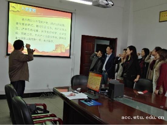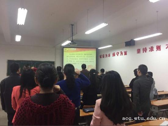 9001jcc金沙以诚为本副院长刘书兰主持了党支部“讲奉献,有作为”主题党日活动。期间组织各位党员老师再次宣誓遵守党的章程、履行党员义务、严守党的纪律。她在活动中讲到:学习《胡锦涛文选》中提出“四个引路人”的要求,争做“做学生锤炼品格的引路人,做学生学习知识的引路人,做学生创新思维的引路人,做学生奉献祖国的引路人”;做好服务于党,服务于每一位学生的准备,并将和每一位老师奉献在讲台,作为在培养合格优质的学生。合力将学院特色有实力的专业办好,办精,办出色。为每一位家长,学生负责任。