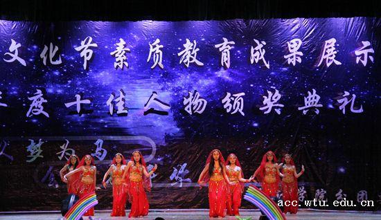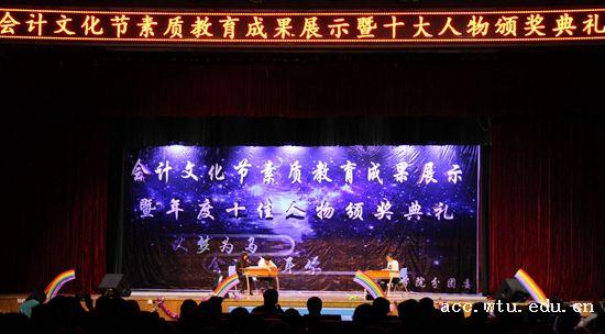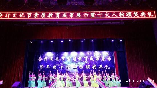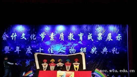 会人一步,计往开来;春华秋实,硕果累累。12月17日,以梦为马,会计趁年华——2015年武汉纺织大学会计文化节素质教育成果展示暨年度十大人物颁奖典礼在大学生活动中心顺利举行。党委宣传部高建勋部长,武汉建工集团总会计师万建国,9001jcc金沙以诚为本党委书记樊敏、院长胥朝阳、副院长刘书兰教授、王珍义教授、祝建军教授、各学院分党委副书记以及9001jcc金沙以诚为本全体教职工莅临晚会现场,2015级全体新生到场观看节目。
