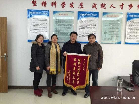 1月26日上午,9001jcc金沙以诚为本院长胥朝阳、分党委书记樊敏一行专程赶到罗田县人社局,将一面绣有“提供‘双实’平台、共创美好未来”的锦旗送到人社局办公室主任周伟手中,以表达对人社局为大学生提供实习实训平台、帮助学生就业的感激之情。