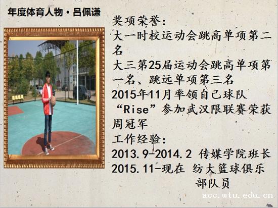 生命在于运动,竞技在于拼搏。锲而不舍,他在赛场上挥洒汗水;永不言败,他在奖杯上刻下辉煌。播撒青春,创造奇迹;挑战极限,超越梦想。迈步向前,他是赛场上飒爽的英杰;奔跑在田径场,他是跑道上永恒的风景,他曾获得校十佳运动员。他是年度体育人物——吕佩谦