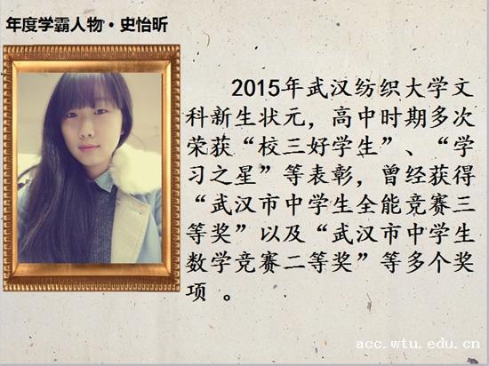 只有勤奋,才能改变内心的贫穷;只有努力,才能闪耀幸福的光环;只有拼搏,才能看到希望和光明的前程。她是武汉纺织大学2015年新生文科状元,她曾经获得“武汉市中学生全能竞赛三等奖”以及“武汉市中学生数学竞赛二等奖”等多个奖项。在勤奋的苦读中持之以恒,永不退却,她就是年度学霸人物——史怡昕