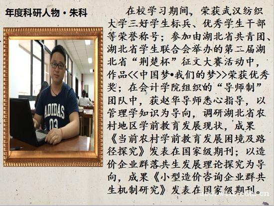 品学兼优,刻苦专研。在书海里,她勤奋上进,孜孜不倦,用饱满的热情扬帆起航;在班级里,她任劳任怨,兢兢业业,用青春的认真感染每个角落。在校期间,多次获得国家奖学金、国家励志奖学金,多篇论文获优秀论文评选一等奖。他就是年度科研人物——朱科。
