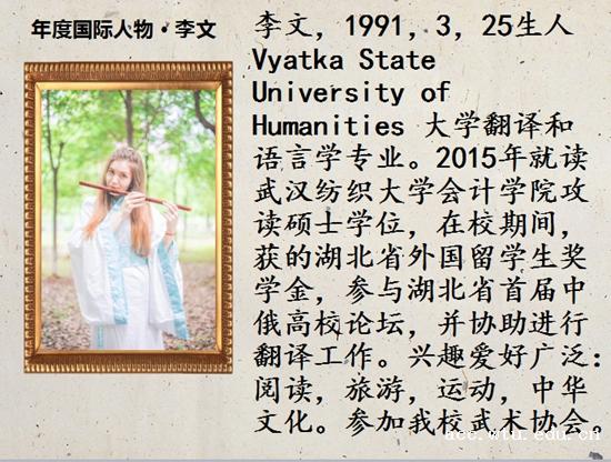千里之行,只为能畅游一番学海,书本上的精神食粮给她们坚持下去的理由;背井离乡,再多的辛酸她们也不曾放弃,故乡的晚星,无数次在她们的梦里闪烁。既然选择了远方,她们便勇往直前。入乡随俗,她们吸收了博大的中华文化;奔赴异地,她们也为我们带来了更多异国风情。她们就是年度国际人物——来自俄罗斯的留学生李文。