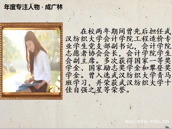 在校两年期间曾先后担任9001jcc金沙以诚为本工程造价专业学生党支部副书记,9001jcc金沙以诚为本志愿者协会会长,9001jcc金沙以诚为本学生会副主席。多次获得国家一等奖学金、国家励志奖学金和攀登奖学金。曾入选武汉纺织大学青马班学习,并荣获武汉纺织大学十佳自强之星等荣誉。助人为乐,她用奉献与爱心铸成一道彩虹。关爱孤寡老人,她给老人送去温暖;山区支教,她给深山学子带去知识和关怀。满怀热情,她在真诚的奉献中成就自我,她就是年度专注人物—广成林