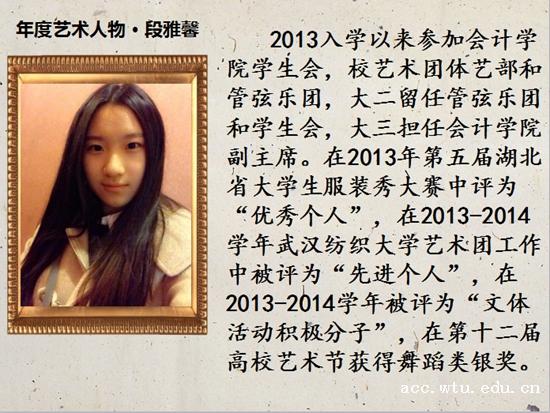 她是舞台上的精灵,她是灯光下的花火,她是文体活动积极分子,她像一道彩虹般绚丽多彩,她为我们的生活添彩加色。在校期间,她曾获得湖北省大学生服装秀“优秀个人奖”和第十二届高校艺术节舞蹈类银奖。炫动青春,活力四射,她就是年度文艺人物——段雅馨