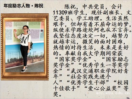 青春在梦想中酝酿,梦想在校园中发芽。他,志存高远,勇于攀登。学习上的他,灯下纸上,孜孜以求,永不懈怠。工作上的他,勤勤恳恳以实际行动诠释责任的意义。他清澈、通透、明亮的声音,传递着对生活的热爱和感恩。他将自己的爱心赋予需要帮助的人,他用他纯真的心,跃动的青春,投入社会实践。他就是年度励志人物——陈祝。