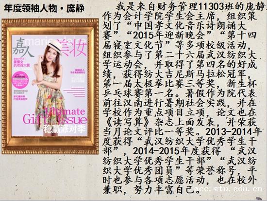能力卓越,工作负责,她是领袖中的杰出人物。作为班长,她是班级力量凝聚的核心;作为学生会主席,她是9001jcc金沙以诚为本学生的榜样。她用汗水浇灌学业,她将激情赋予工作。他用自己的智慧和行动带领9001jcc金沙以诚为本学生会不断向前。她就是年度领袖人物——庞静