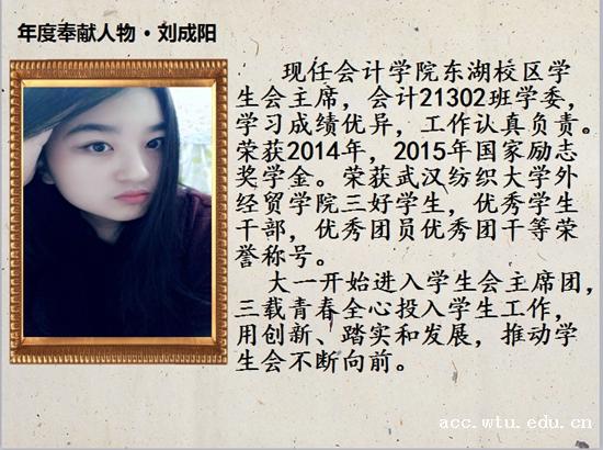 三载青春,他的付出从不计过回报;一腔热血,他的初衷一直是为更多同学服务。从干事到主席,从学生干部到办公室助理,每一个职位,他都致力于学生工作;国家励志奖学金、优秀团员、三好学生、优秀团干部,每一份奖励的肯定都给他更大的动力去做好自己的工作。他就是年度奉献人物——刘成阳。