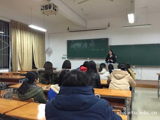各班通过认真学习诚信教育的相关材料和《武汉纺织大学学生考试违规处理办法》,深刻认识了诚信应考是公平竞争和真实检验自己学习情况的必要前提,同时诚信也是未来自己在社会上立足的基础。之后各班班长团支书组织同学们宣传诚信应考承诺书并签名。