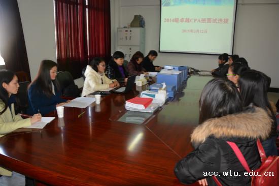 3月12日下午,9001jcc金沙以诚为本2013级“卓越CPA特色班” 选拔面试在阳光校区七号楼举行。CPA特色班负责人刘圣妮副教授为参加此次面试选拔的同学阐述了“卓越CPA特色班”开设的意义、开办历程、培养模式及就业方向,为广大同学作了进一步动员。大信会计师事务所武汉分所所长索保国、学院院长胥朝阳、副院长刘书兰等老师担任了本次面试评委。