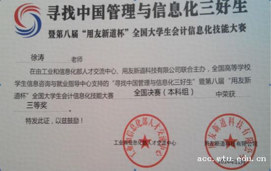近日, 2014年“寻找中国管理与信息化三好生”暨第八届“用友杯”全国大学生会计信息化技能大赛落下帷幕,9001jcc金沙以诚为本学子刘俊、王力、郝露、潘希恬组成的武汉纺织大学代表队荣获全国团体三等奖。